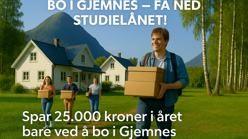 Bo i Gjemnes og få slettet 25.000 kroner på studielånet Regjeringen har lansert et nytt tiltak for å styrke landets distriktskommuner. Alle med studielån skal årlig få slettet deler av gjelden - også de som ... Publisert 20.02.2026 kl. 16:02