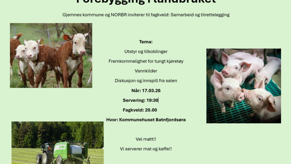 Fagkveld om forebygging i landbruket 17. mars Velkommen til fagkveld om samarbeid og tilrettelegging i landbruket.Gjemnes kommune og Nordmøre og Romsdal brann og redning IKS (NORBR) inviterer til ... Publisert 11.03.2026 kl. 12:08
